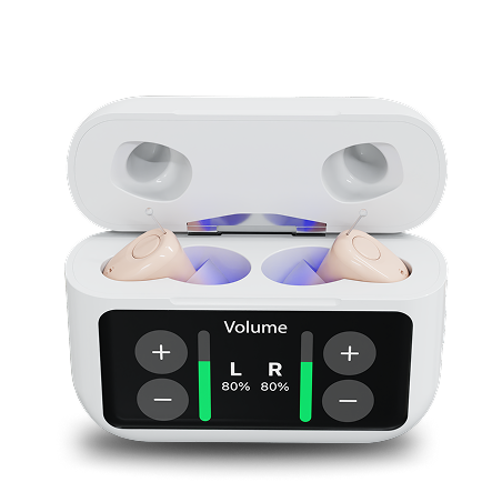 Audien Hearing Atom 2 hearing aids with open charging case showing one device elevated